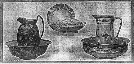 Another inexpensive toilet is the "Shell" shape with decoration "B" the shape having a scalloped top remindful of a seashell, and a prominent embossment, the latter, along with the neck and handle, being simply shaded in bronze-green. Amongst the more ambitious decorations in toiletware must be mentioned the "Daisy" pattern which consists of a fawn shaded ground, now commonly spoken of in most quarters as a "Worcester" ground, with an applied lithograph panel, the shape being one of ornamental characteristics, and the decorative finish involving a studiously elaborate gilding in order to lend the pattern additional 'effect'.